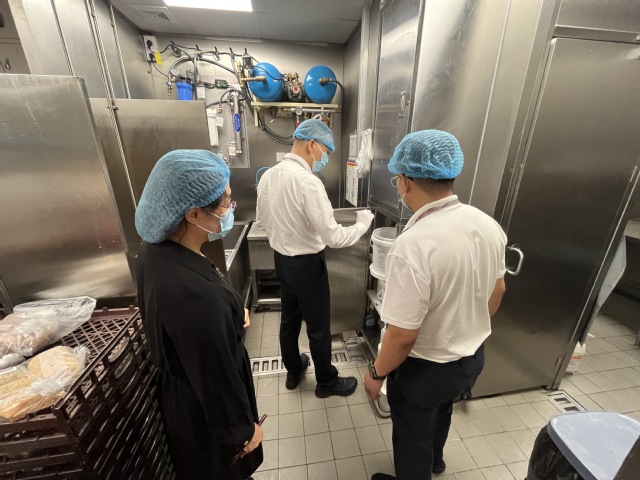 为深入贯彻落实珠海市金湾区市场监督管理局召开的金湾区高校食品安全工作会议精神,切实保障全校师生饮食安全与身体健康,4月3日上午,学校党委委员、副校长方壮坚在参加完区级会议后,第一时间采取“四不两直”方式,率队对校内食堂后厨开展突击检查,后勤处相关负责人陪同检查。